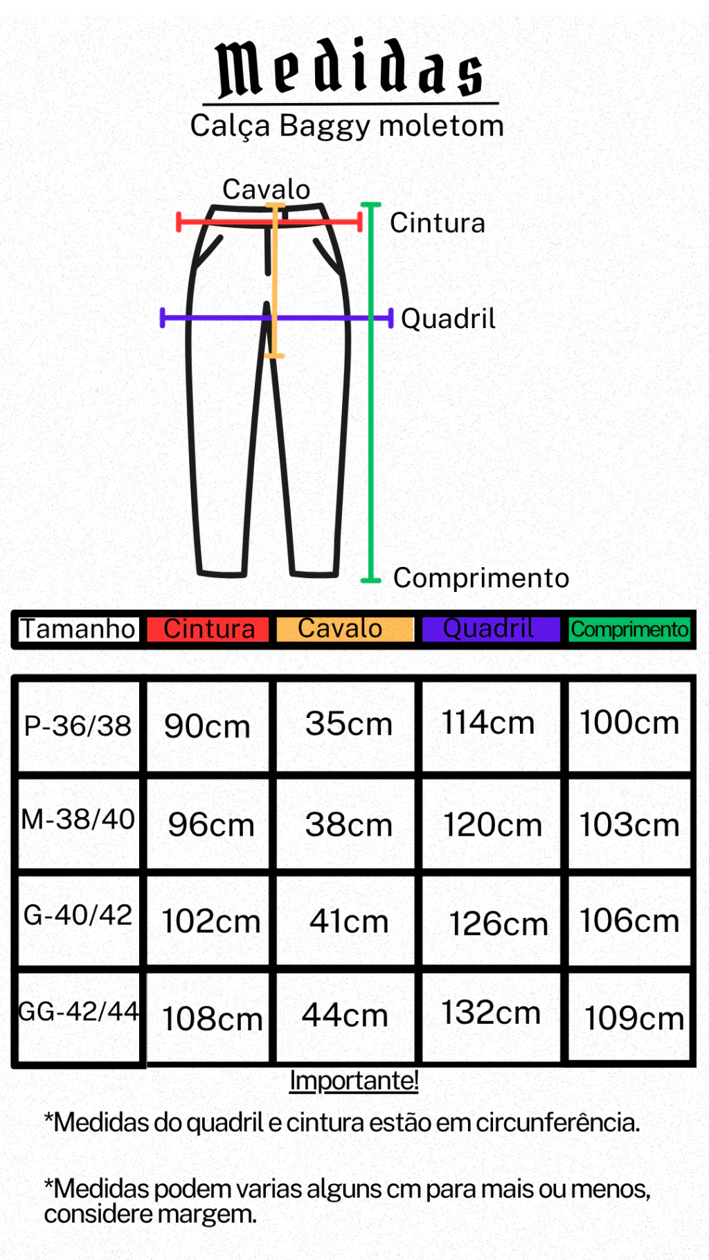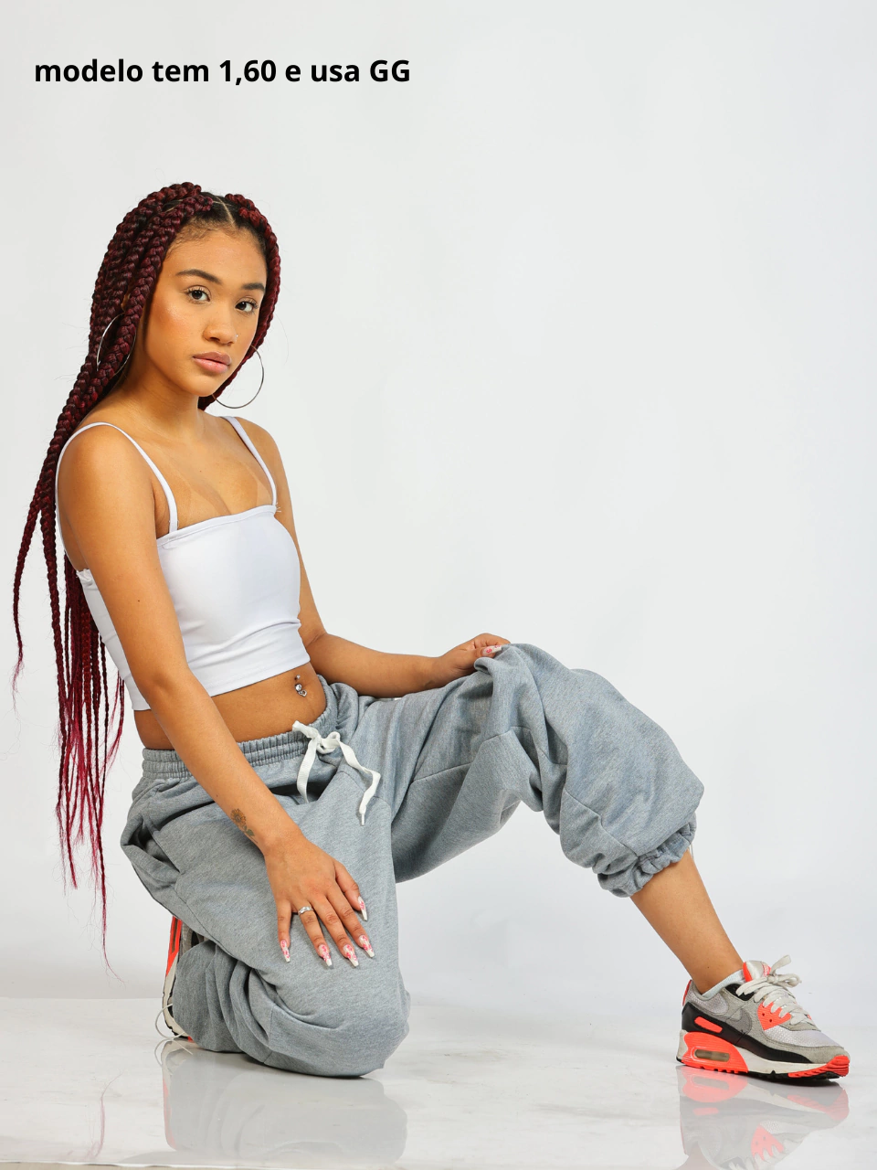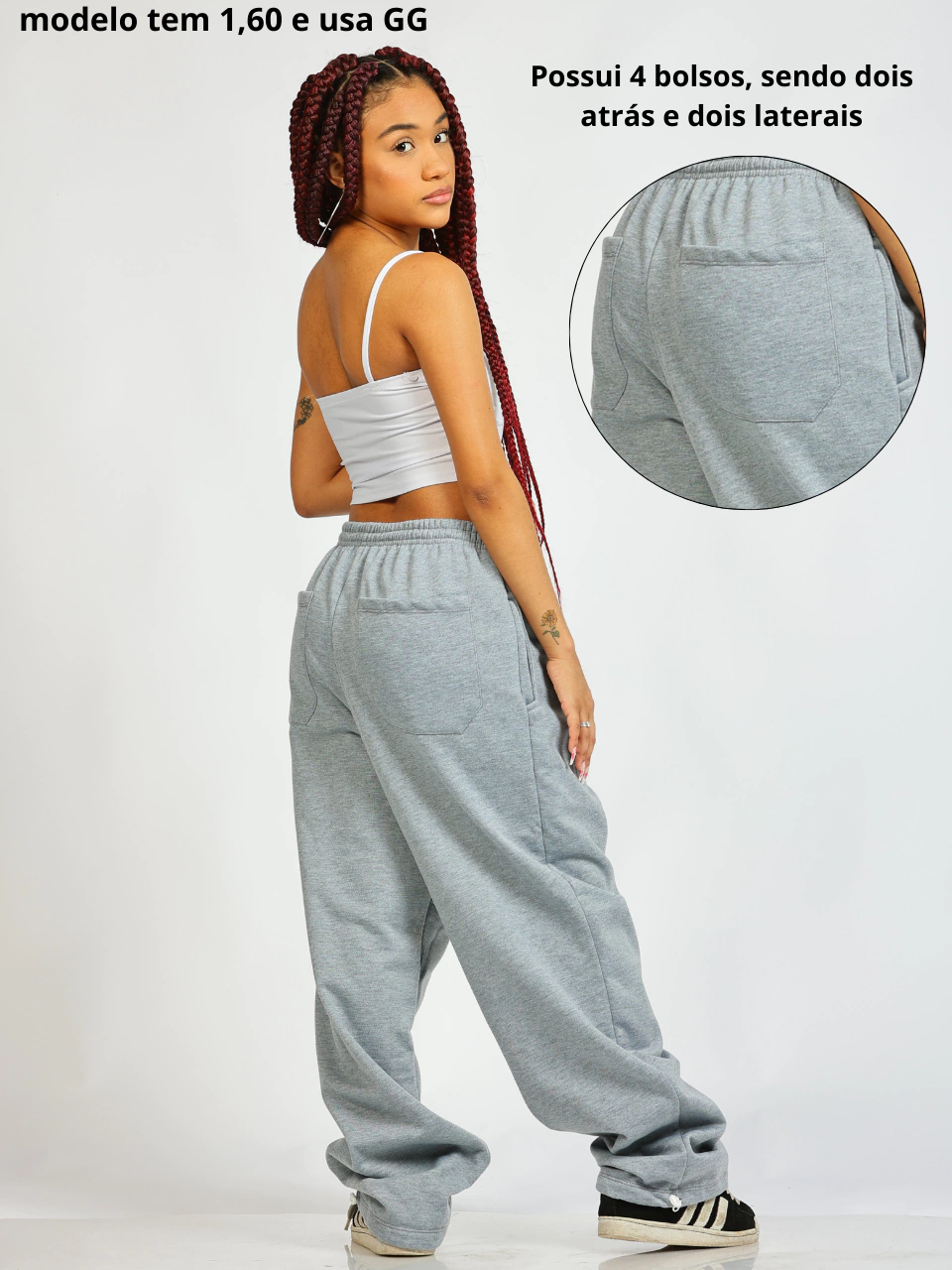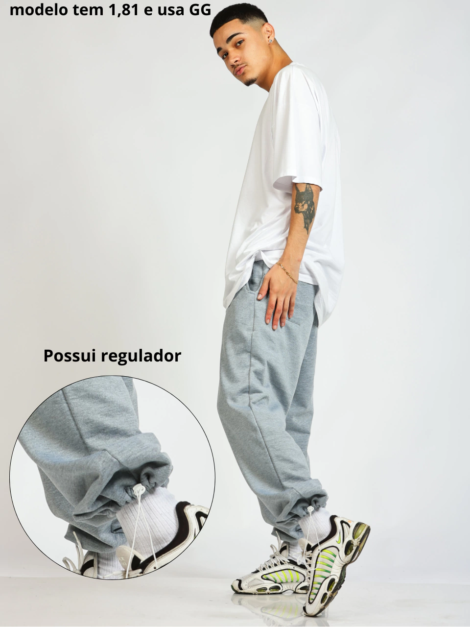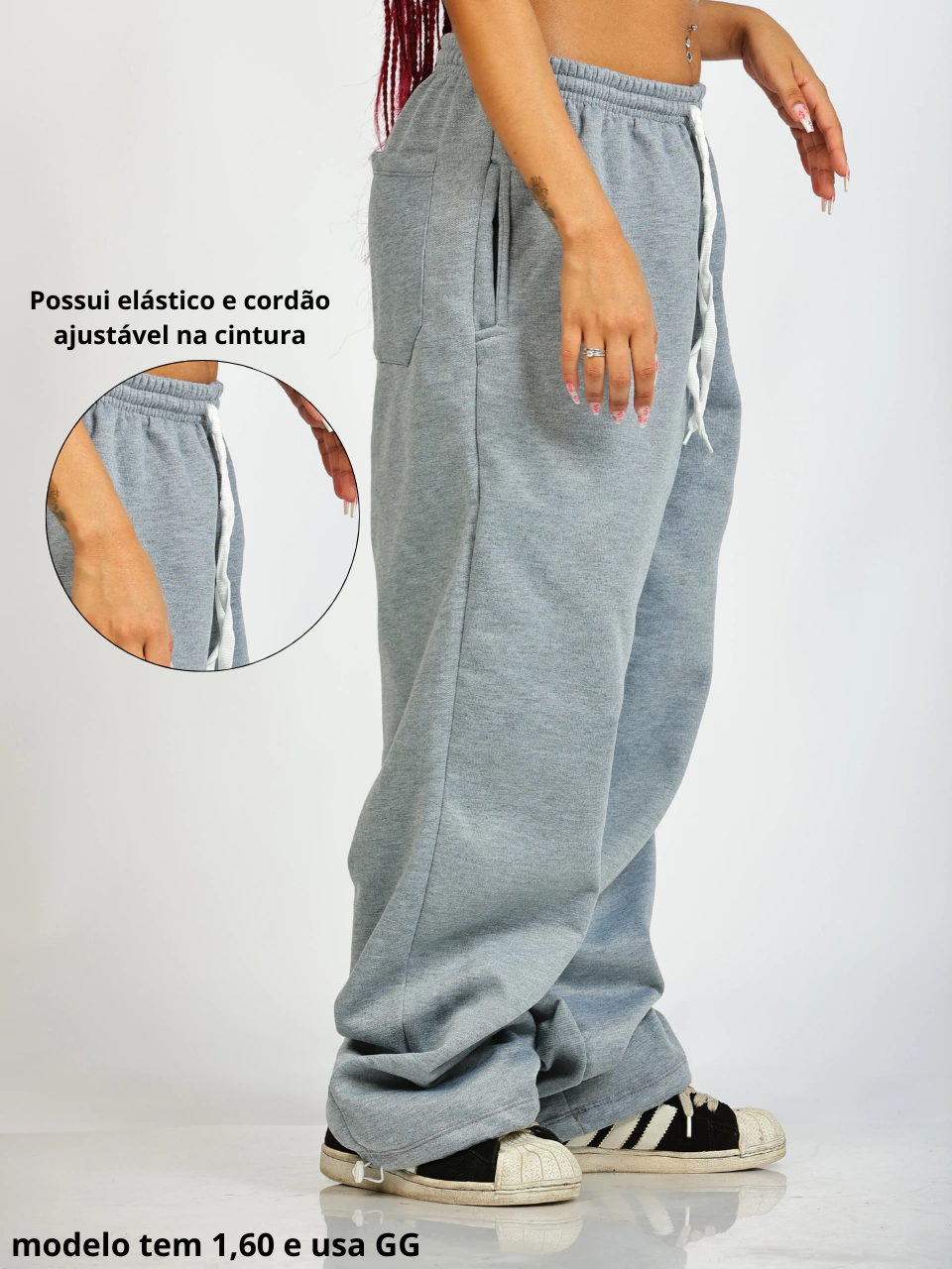 A calça baggy moletom cinza combina conforto extremo com estilo urbano Essa peça é confeccionada em moletom 2 cabos, flanelada por dentro ou seja, é quentinha e perfeita para os dias frios. Possui ajuste na barra com regulador, podendo ser usada no estilo jogger ou com a barra solta. A cintura tem elástico e cordão interno para amarração, e pode variar entre as cores preta ou branca, de acordo com a disponibilidade em estoque.