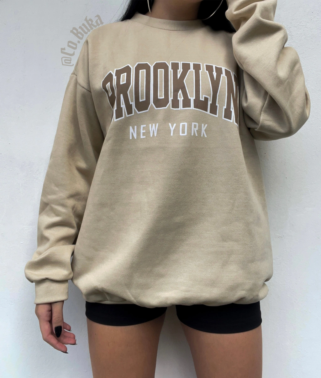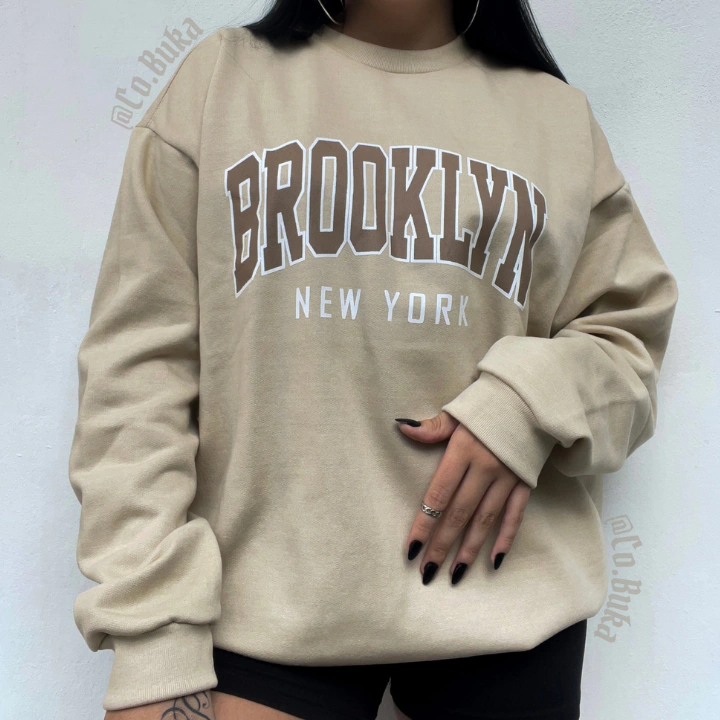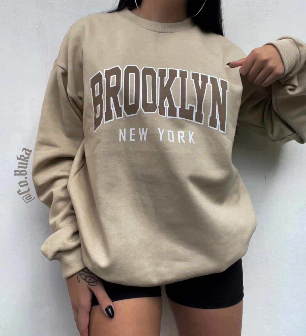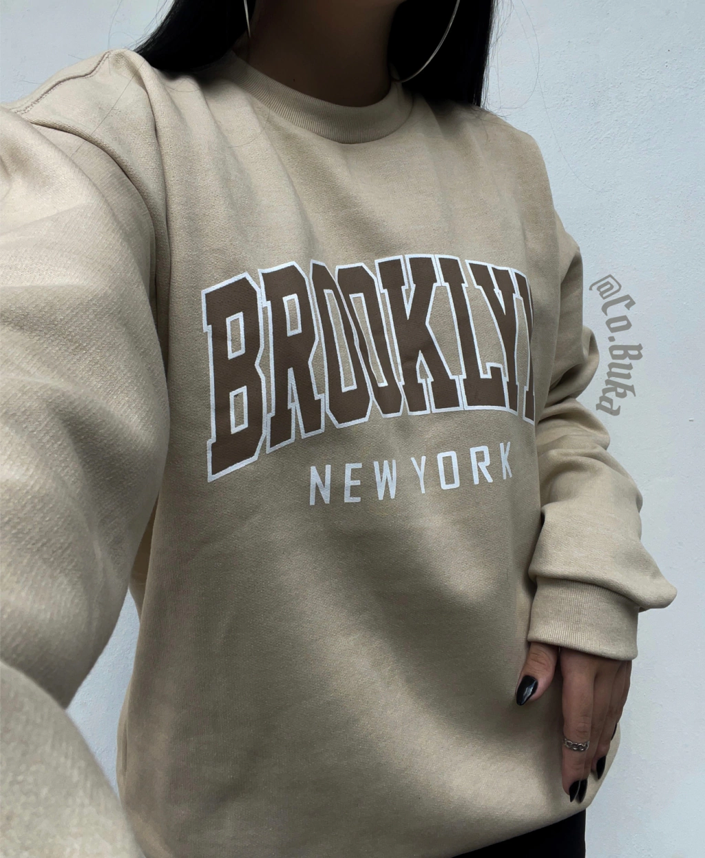O moletom brooklyn bege possui a base flanelada e é super grossinho. Tecido 50% algodão 50% poliéster. Sua estampa é feita em silk e ele vai bem com tudo!
