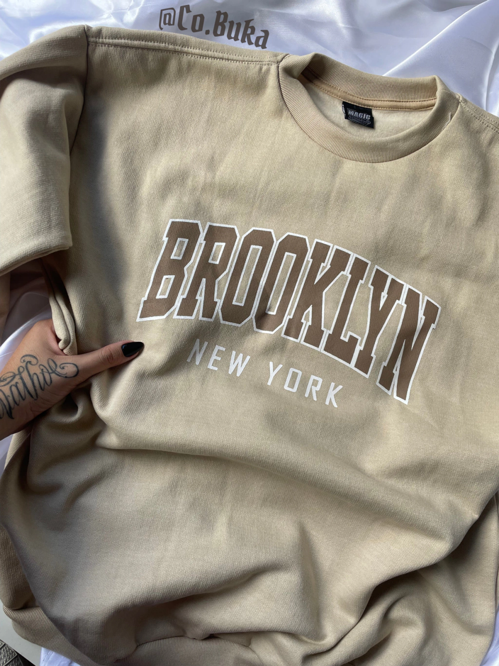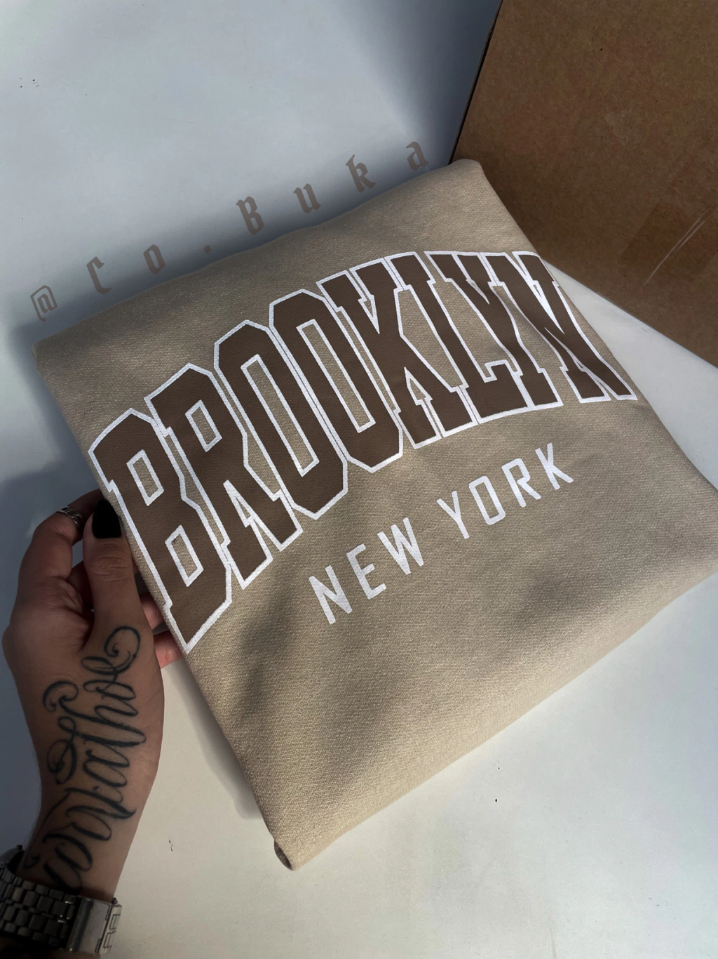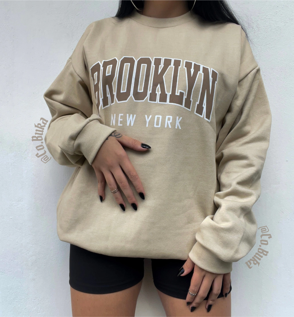 O moletom brooklyn bege possui a base flanelada e é super grossinho. Tecido 50% algodão 50% poliéster. Sua estampa é feita em silk e ele vai bem com tudo!